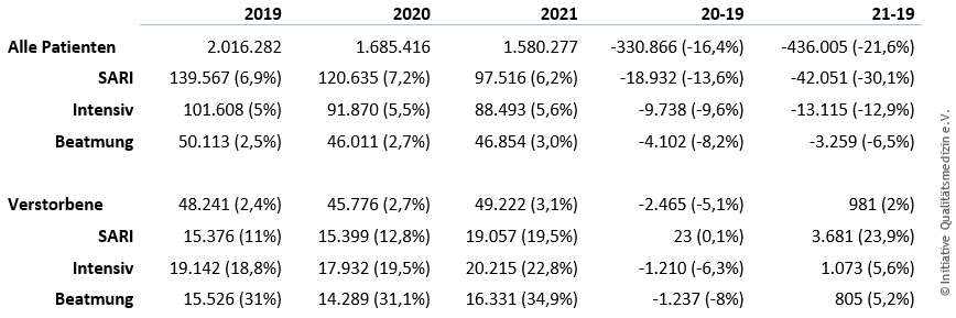Im gesamten Jahr 2020 wurden insgesamt 13,3% weniger Patienten im Krankenhaus behandelt als 2019. In den ersten 23 Kalenderwochen des Jahres 2021 blieb die Fallzahl 21,6% hinter dem Vergleichszeitraum 2019 zurück. Auch die Gesamtzahl der SARI-Fälle, Intensivfälle und Beatmungsfälle blieb im Untersuchungszeitraum unter den Zahlen aus 2019.