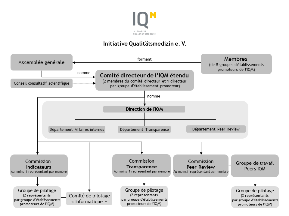 En tant qu'association d'utilité publique, l'Initiative Qualitätsmedizin se compose de plusieurs organes : L'organe suprême est l'assemblée générale, qui nomme le comité directeur, les directeurs et la direction, et leur donne quitus. Le travail sur le contenu est effectué par les trois commissions de l'IQM (Indicateurs, Évaluation par les pairs et Transparence), ainsi que par le conseil consultatif scientifique.